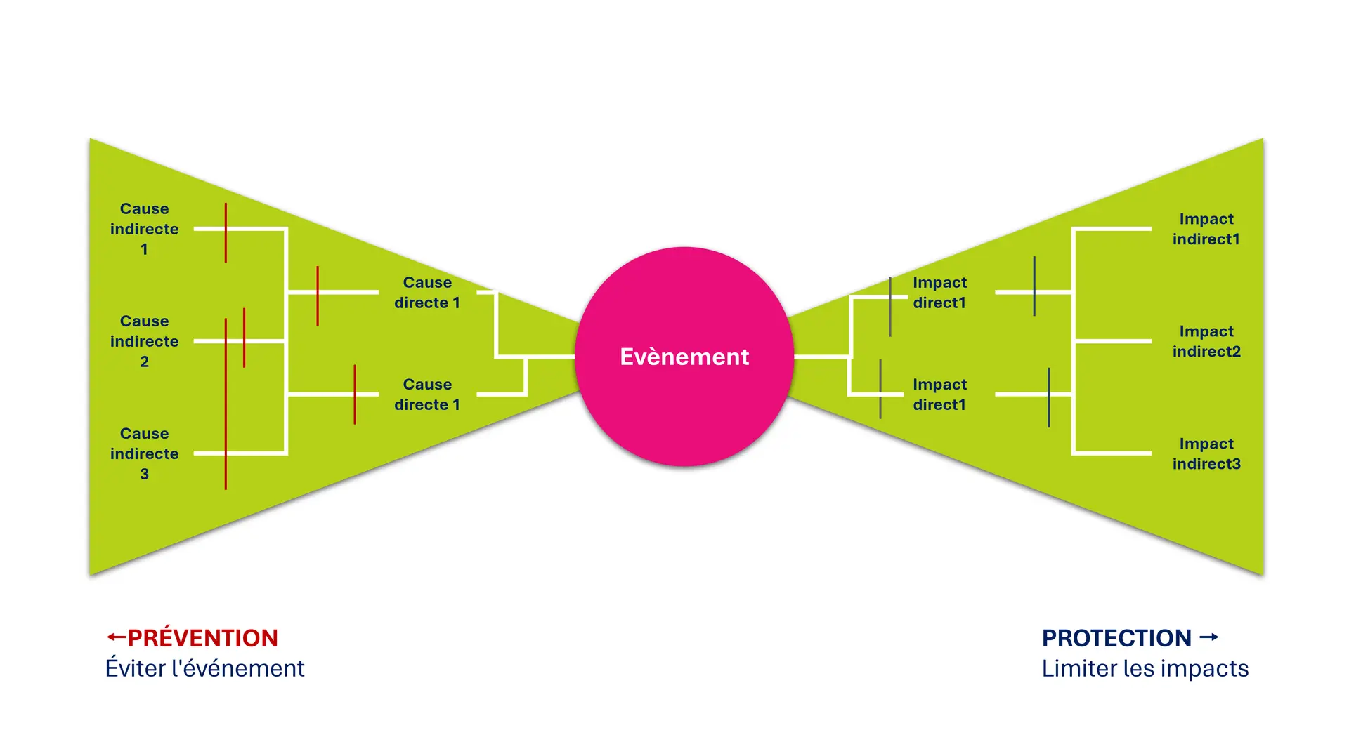 La méthode Bow-Tie est une technique d'analyse et de gestion des risques qui combine deux approches complémentaires : l'arbre des causes (analyse a priori) et l'arbre des conséquences (analyse a posteriori). Elle se structure autour d'un événement redouté central, avec d'un côté les menaces qui peuvent le provoquer et de l'autre les conséquences qui peuvent en découler.